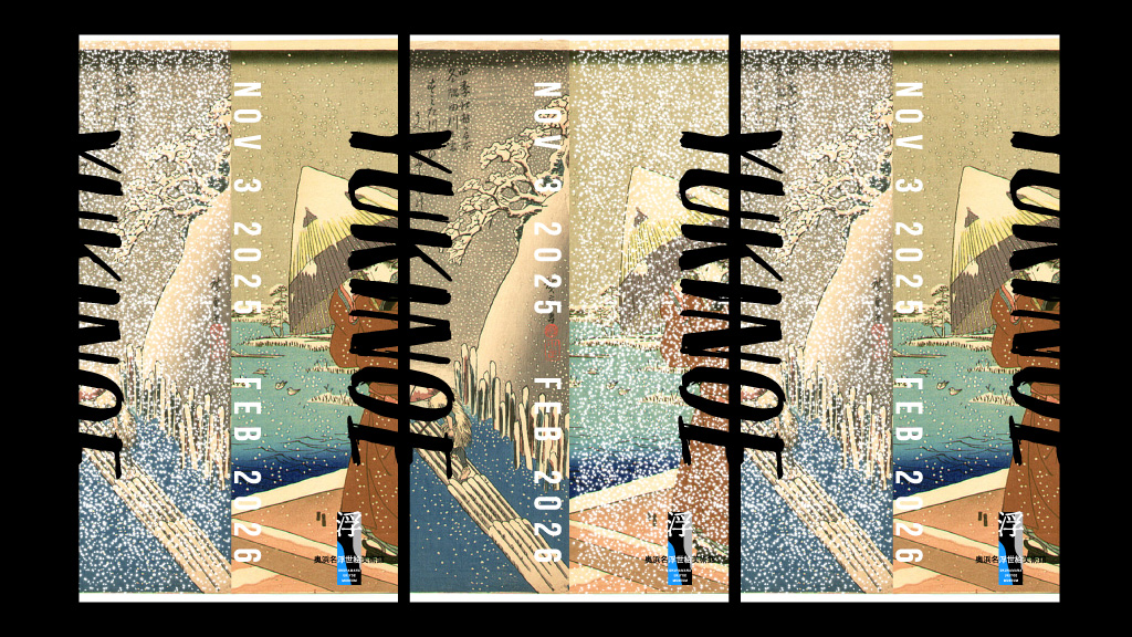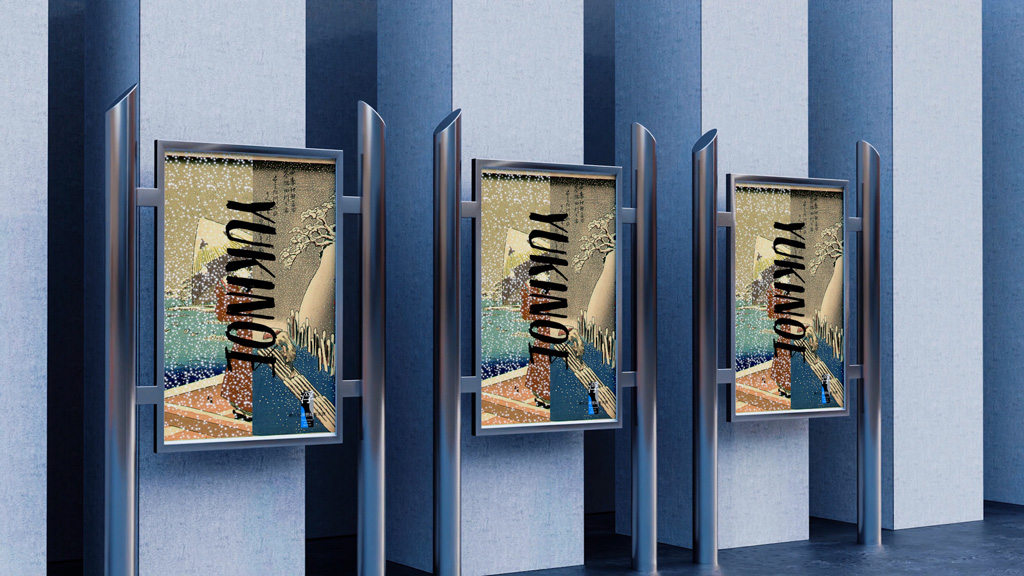 冬をテーマにした美術展であり、展示する作品に雪を描いたものが多いため、「YUKINOE(雪の絵)」を美術展の名称としてご提案いたしました。デジタルサイネージ向けでは、雪がいつまでも降り続くイメージをリズム良いリピート感で表現。ポスターは連貼りすることで横方向に時間軸を感じさせるものに。チケットは2回目以降の来場にもつながるデザインとしました。